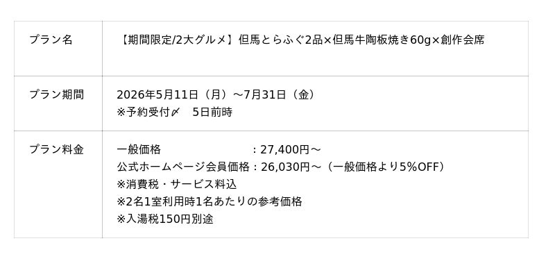 「アイアンドエフ・ビルディング株式会社(本社:大阪市北区、代表取締役:泉 邦治)が運営するビナリオホテルズ&リゾーツの施設である「山陰湯村温泉 湧泉(ゆうせん)の宿ゆあむ」(兵庫県)では、兵庫県北部/但馬地方の地産地消食材<但馬とらふぐ・但馬牛>を楽しむことができる、期間限定グルメプランを【2026年5月11日(月)~7月31日(金)の月~金曜日限定】でご提供いたします。