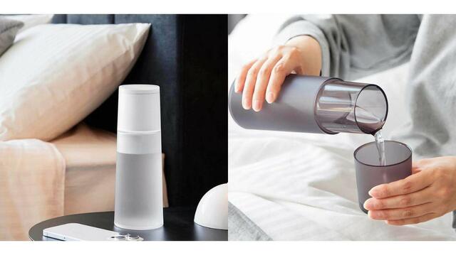 コップがそのままフタになる一体型デザイン。ホコリの侵入を防ぎながら、ベッドサイドでも場所を取らないミニマルな仕様になっています。