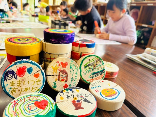 地元ときがわ町の学童保育 ひまわりクラブを訪問し、子供たちからの身近な女性に向けたメッセージをヒノキ入浴木に記入していただきます。