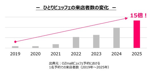 スターツ出版株式会社(本社:東京都中央区、代表取締役社長:関根赴治)が運営する「OZmall(オズモール)」(会員数500万人)では、近年増加している“ひとりビュッフェ”の利用動向を、予約データおよびユーザーアンケートから分析しました。 OZmallにおける「ひとりビュッフェ」の予約数は、2019年以降約6年間で約15倍に増加。「ビュッフェは複数人で行くもの」という従来の常識が、少しずつ変わり始めています。 OZmallでは、こうしたニーズの高まりに合わせて、来年3月まで毎月「おひとりさま貸し切りビュッフェ」イベントを開催します。
