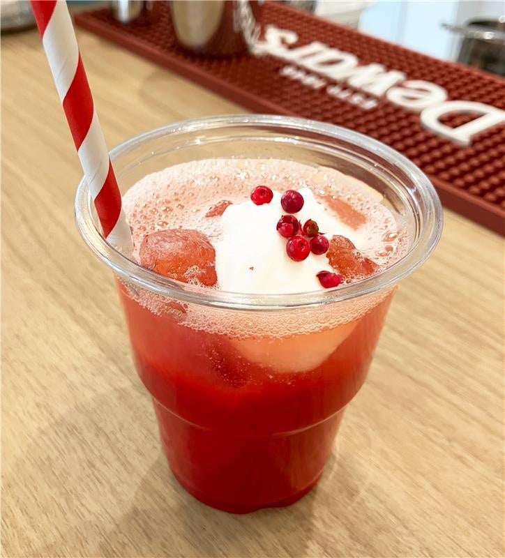 レンフロ・ジャパン展示会恒例テーマジュース。今回は「ホカロン」テーマで赤いザクロ×ブラッドオレンジジュースにヨーグルトをトッピング。