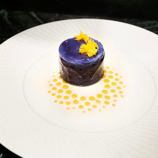 香ばしく焼き上げた焼き茄子と、京都老舗味噌屋「山利」の白味噌のコクに、ローズマリー香るバタフライピーのジュレをアクセントに重ねたタルトです。