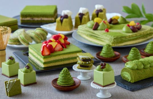 抹茶のショートケーキ / 抹茶のクッキーサンド / 抹茶のモンブラン / 抹茶のオペラ / 抹茶のブランマンジェ / 抹茶風味のわらび餅 / 抹茶の串団子 / マカロン など