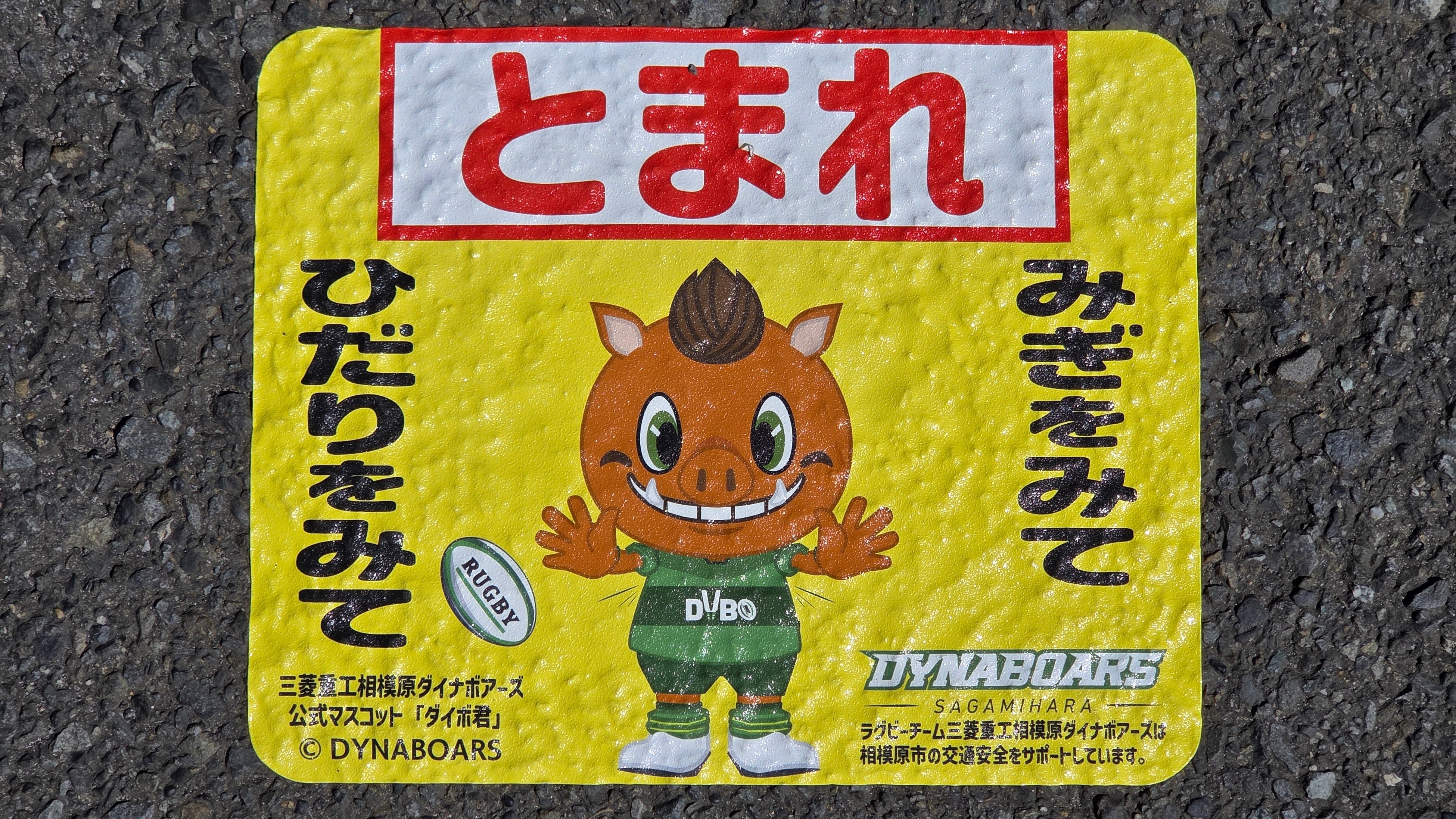 公式マスコット「ダイボ君」が両手を広げて一時停止を呼びかけるイラストとともに、ひらがなで大きく「とまれ」「みぎをみて」「ひだりをみて」と記載。小さなお子様でも直感的に理解しやすく、注意を惹きつける視認性の高い黄色をベースカラーに採用しています。
