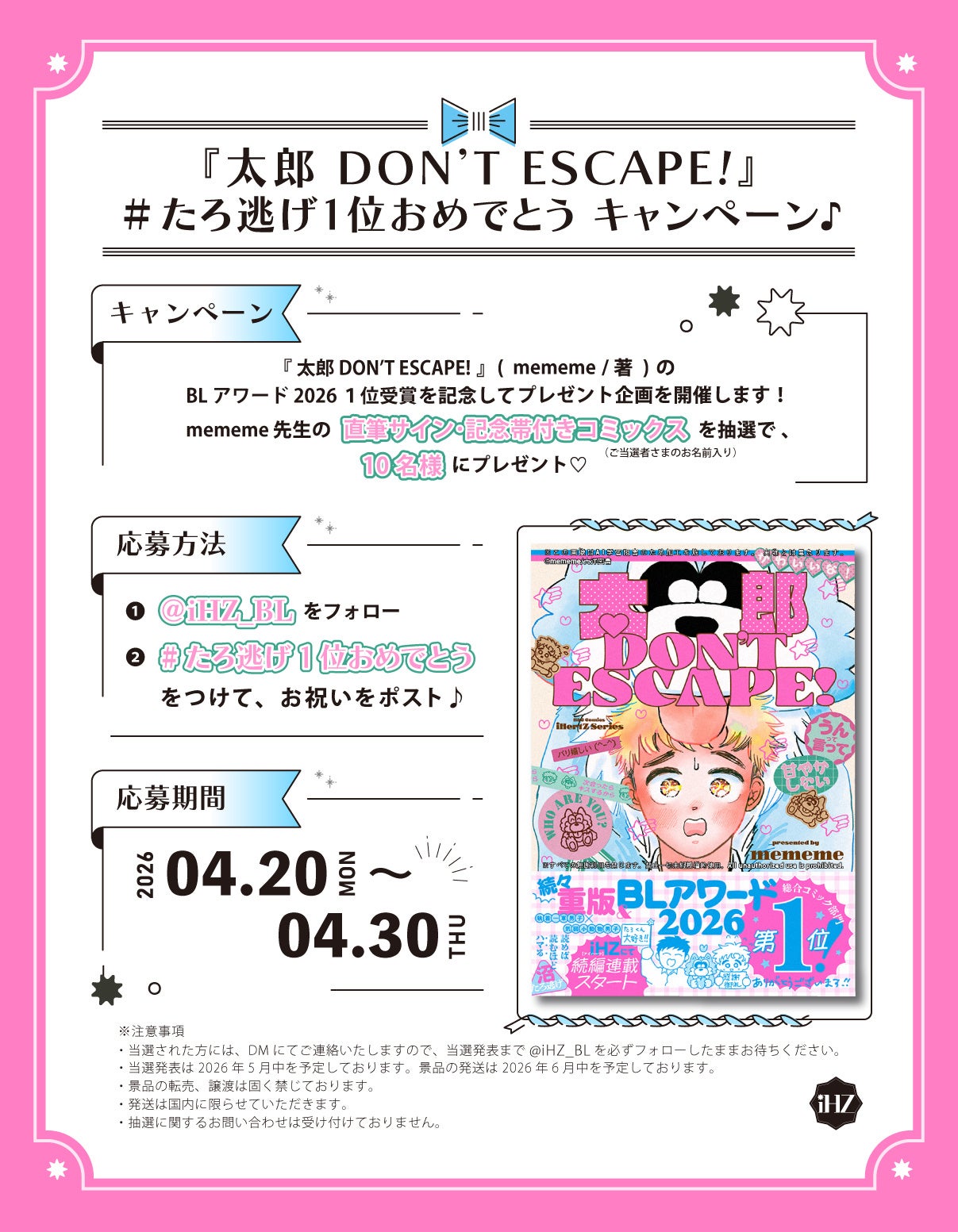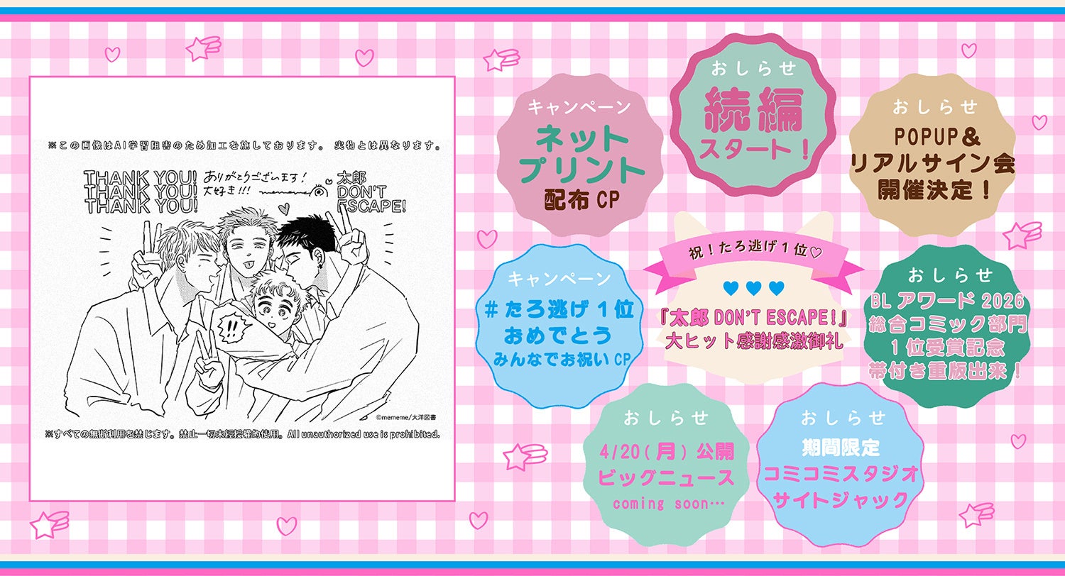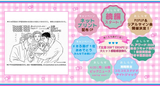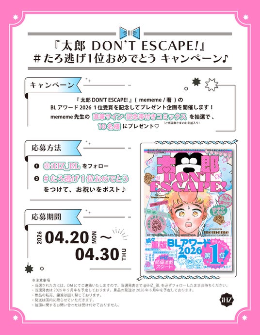 この度、第17回「BLアワード2026」において『太郎 DON’T ESCAPE!』が総合コミック部門の第1位に輝きました!特大ニュース&感謝御礼企画が目白押し。要チェックです!