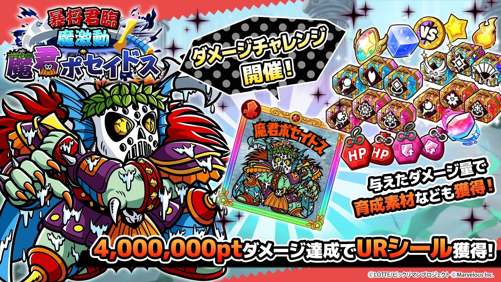 また専用の称号や、400万Ptのダメージ到達でURシール「[暴将]魔君ポセイドス」を獲得できますので、ぜひご参加ください!