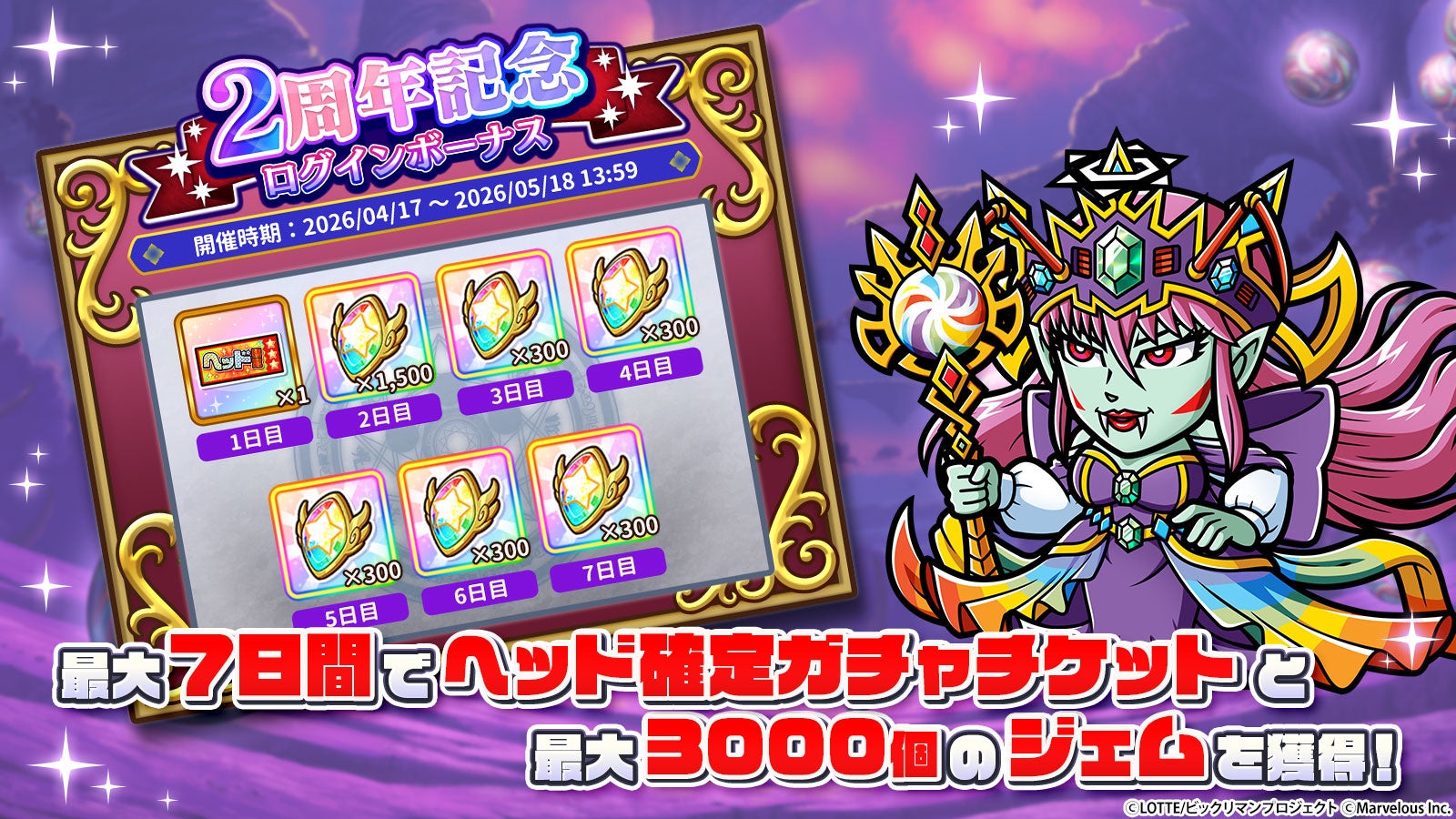 1日目は「ヘッド確定ガチャチケット」を、2日目以降は最大でジェムを合計3,000個を獲得できるログインボーナスを開始いたしました。