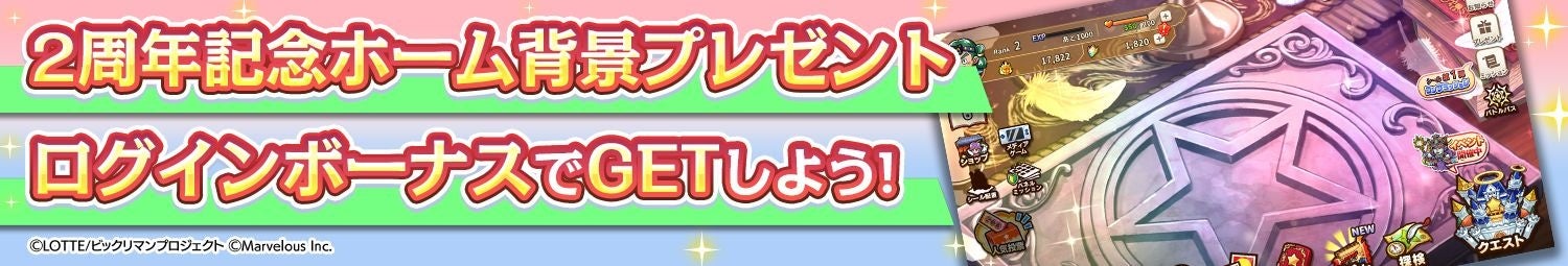 本メンテナンス後より、2周年を記念した特別な「ホーム背景」を獲得できる、ログインボーナスを開始いたしました。