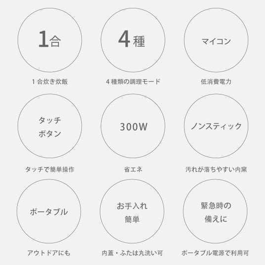 300Wの省エネ設計により、中型のポータブル電源でも調理が可能で、コンパクトながら「炊く・低温・発酵・揚げ物」の4つの調理モードを搭載。