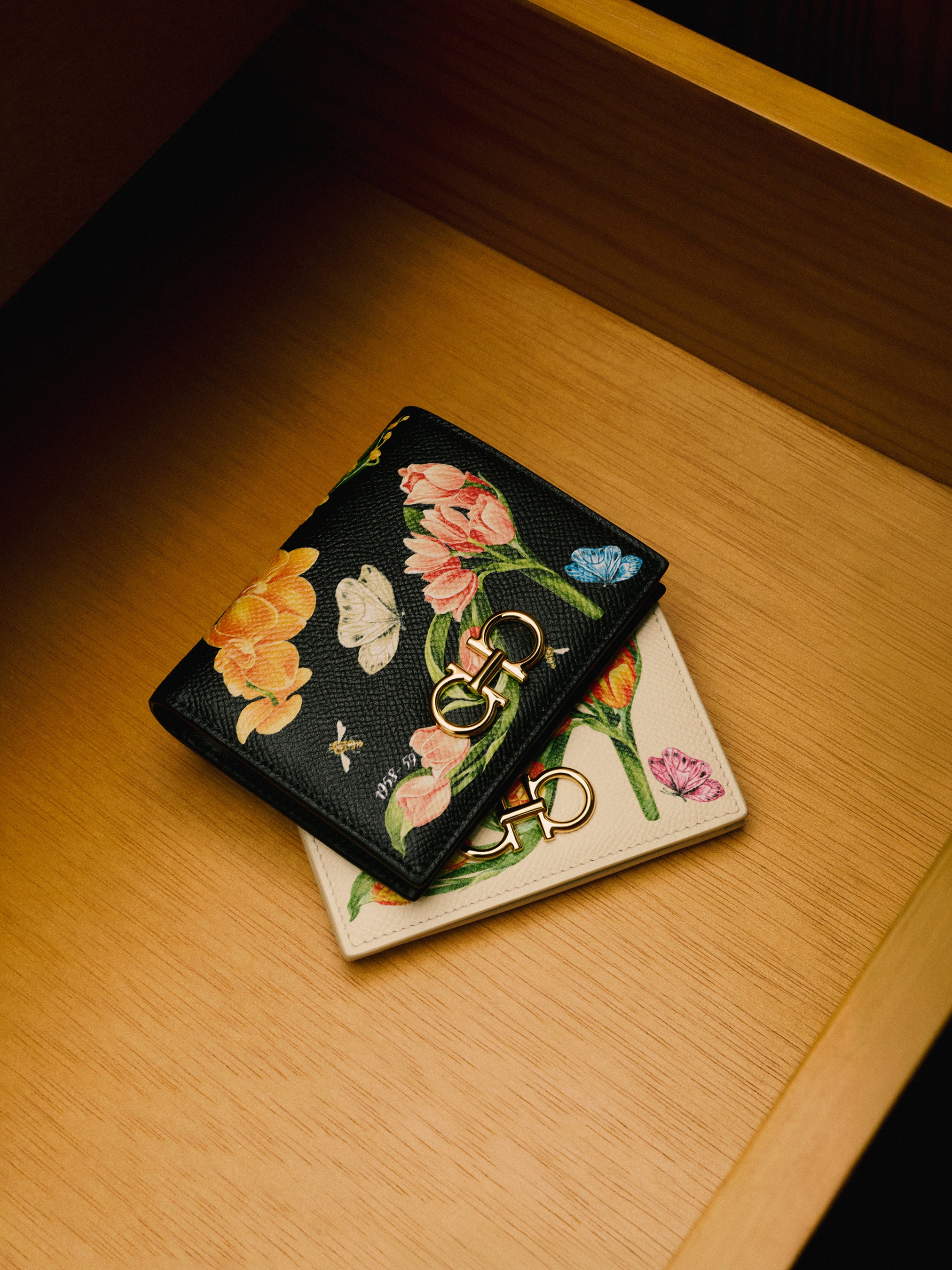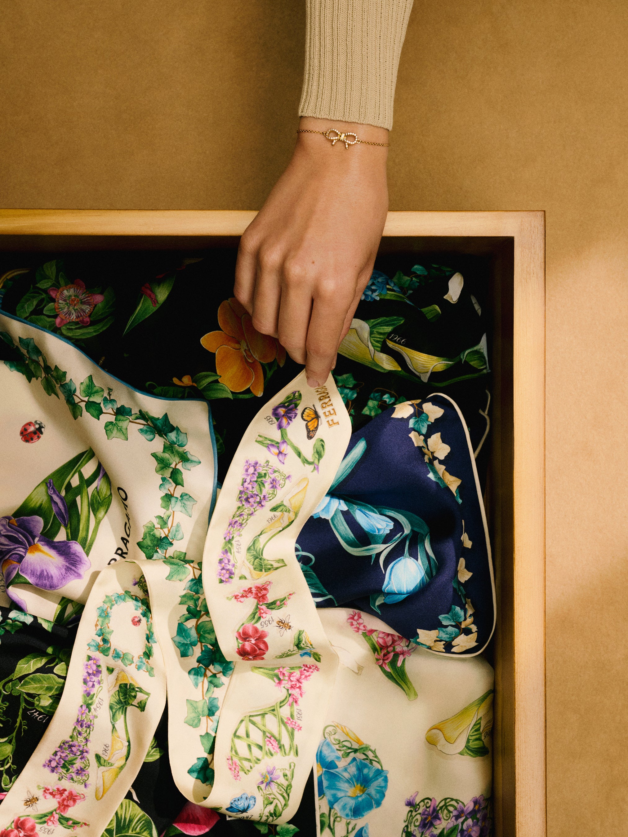 新作「Hug Soft XS」と並んで展開される、シルクスカーフとバンドゥのスペシャルセレクションは、象徴的なプリントとフラワーモチーフというブランドの伝統を映し出し、花々や葉、花びらを繊細に配置し、フェラガモのアーカイブに残るアイコニックなシューズデザインを描いている。