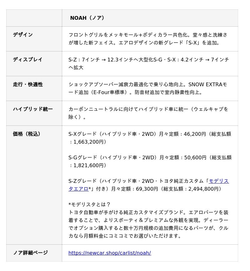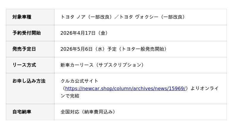 新車カーリース「クルカ」を運営する株式会社クルカ(本社:東京都千代田区、代表取締役社長:早川 由紀夫)は、トヨタ自動車株式会社が2026年4月10日に発表した人気ミニバン「ノア」および「ヴォクシー」の一部改良モデルについて、先行予約の受付を開始いたしましたので、お知らせいたします。