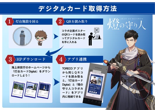 本コラボでは、TORECO上にて1基の灯台につき2種類のデジタルカードを入手することができます。ひとつは、海上保安庁がこれまで配布してきた「灯台カードDigital」。もうひとつは、『燈の守り人』オリジナルの灯台コラボカードです。これら2種類のカードが、同一のプラットフォーム上でダウンロードできるようになります。