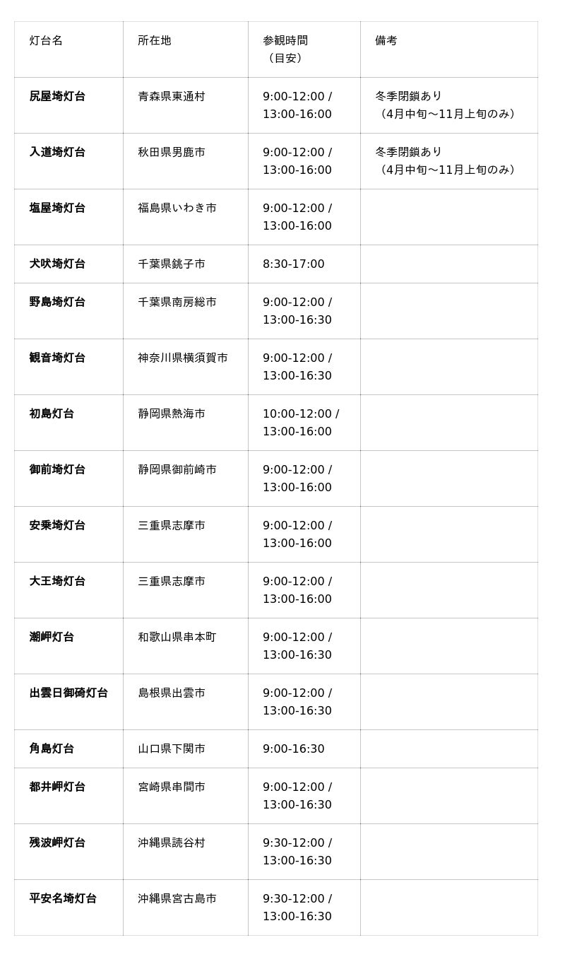 - 昼休み: 多くの灯台で12:00~13:00の間は参観が休止されています。