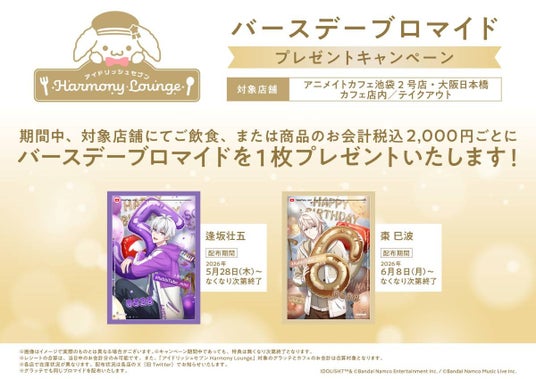 また、各アイドルの誕生日より数日間、バースデードリンクの提供、誕生日を記念したグッズの販売や、バースデーブロマイドがもらえるプレゼントキャンペーンを実施いたしますので、チェックしてみてください!