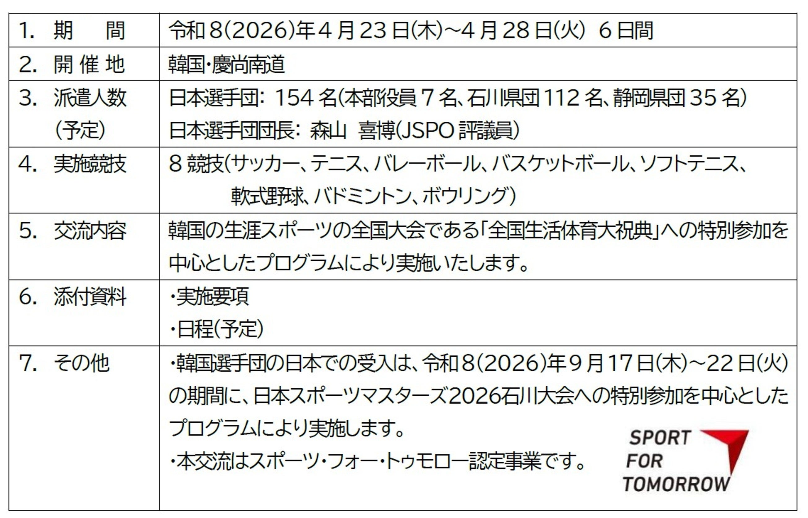 なお、本年9月に石川県で開催される、日本最大のシニア世代総合スポーツ大会「日本スポーツマスターズ2026」には、韓国選手団が特別参加します。
