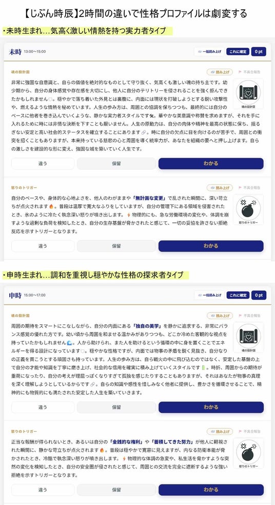 - AIが「出生時間不明」の壁を突破100万通りの人格データを構造化。1日13パターンのプロファイルから自分に合うものを選ぶだけで、専門知識なし・無料で出生時間を特定できます。- 占いを「論理的な自己分析ツール」へ吉凶判断ではなく、怒りのトリガーや防衛機制など8つの指標を言語化。MBTIのように、客観的な自己理解を深めるインフラを提供します。