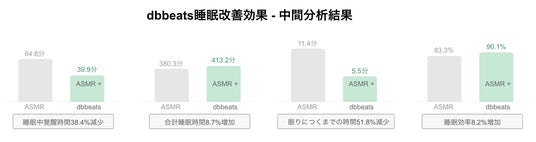 2025年に韓国・亜州大学病院で実施された臨床試験(参加者40名のうち18名に対する中間結果)において、For me budsを使用したグループは主要な睡眠関連指標において改善が確認されました。特に 入眠時間の短縮(約51%改善)、総睡眠時間の延長(約16%改善)、睡眠効率の改善(約13%改善)、覚醒回数の減少(約24%改善) といった効果が統計的に有意に示されており本製品の科学的有効性が裏付けられています。