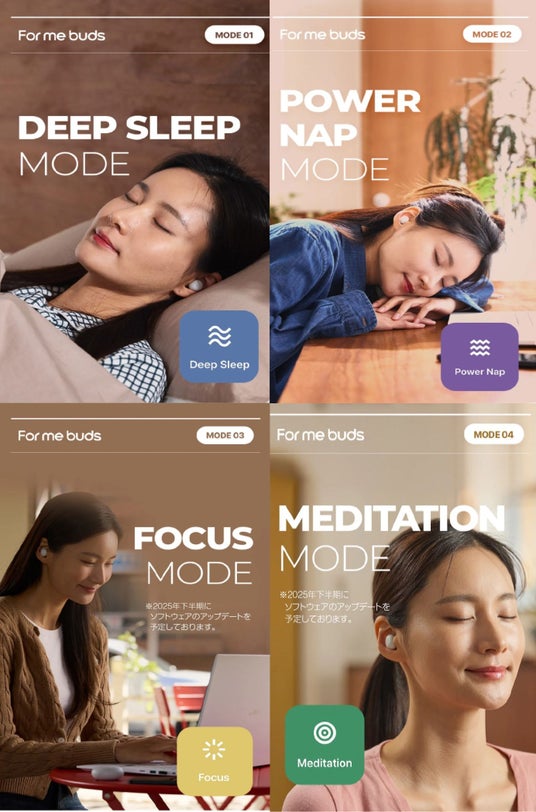 革新的な睡眠サポートイヤーバッド「For me buds(フォーミー・バッズ)」はLG社出身の技術者チームが長年にわたり開発を続けてきた「dbbeats(ダイナミック・バイノーラル・ビーツ)技術」を搭載し、CES 2025でも実証された信頼性の高いソリューションです。日本市場向けの完全日本語対応版として本格的に展開されています。