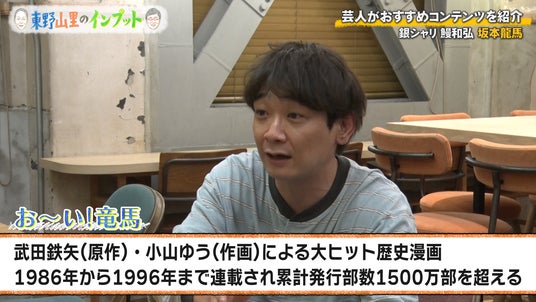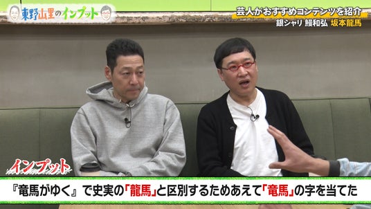 「#62」のテーマは「坂本龍馬」で、プレゼンターは鰻和弘(銀シャリ)が務めます。マンガ『お~い!竜馬』(小学館)や小説『竜馬がゆく』(文藝春秋)などはもちろん、さまざまな資料を読んだという鰻が、エンターテインメント化されている坂本龍馬が実際はど んな人物なのか、語ることに。早速、龍馬の功績を紹介する鰻でしたが、東野と山里は苦笑い。東野は「知っている話を聞かんとアカンの?」とツッコミを入れます。鰻は苦笑しつつも、知らない人のための基本情報として重要だと返します。