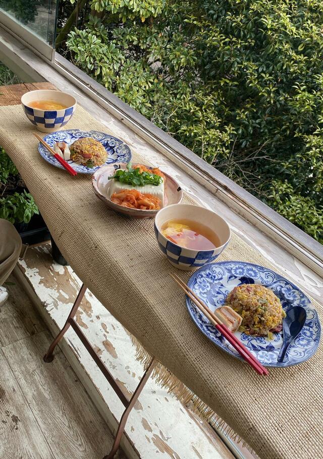 いろんなものが入っているTORUくん作の炒飯。トマトと卵だけの私作スープ、絹豆腐と白菜キムチ。