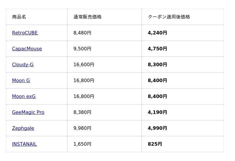 同ショップではこれまで、スマートデバイスや周辺機器をはじめ、機能性とデザイン性を兼ね備えたガジェット製品を幅広く展開し、多くのお客様にご利用いただいてまいりました。日常をより快適に、よりスマートにする製品ラインナップは、多くの支持を集めてきました。今回の閉店にあわせて、人気製品を中心に、クーポン適用で最大50%OFFの特別価格にてご提供いたします。これまで気になっていた製品を手に取る絶好の機会として、ぜひご活用ください。