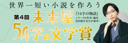 株式会社未来屋書店(本社:千葉県美浜区、代表取締役:平川雅隆)は、大ヒットシリーズ『54字の物語』(PHP研究所刊)の企画・編著者である氏田雄介氏を選考委員長として迎え、第4回未来屋54字の文学賞を開催します。この文学賞は募集テーマに沿った内容の物語を9マス×6行の正方形の原稿用紙、54字ぴったりに収める究極の短編小説を募集する文学賞です。