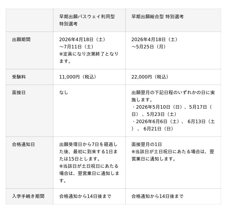 2026年度入学試験では年明けに受験者が集中したことを踏まえ、早期出願制度を設けました。