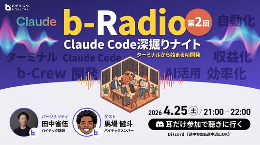 「b-Radio」は、b-Crew内のDiscordボイスチャットで開催される、リスナー参加型のラジオ企画です。今回は第2回目の開催となり、Claude Codeを題材に、実際に何が作れるのか・どう仕事や日々の業務に落とし込めるのか・強みや収益化にどうつなげるのかといったテーマを、講師陣がざっくばらんに掘り下げていきます。