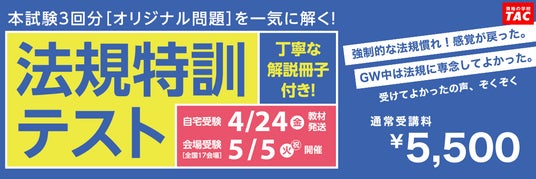 法規をあびるように解きまくることで見えてくる一歩先の世界。本試験前にまとまった時間が取れる最後のチャンス、ゴールデンウィーク、TACの法規対策にあなたの時間をささげてくれませんか?絶対後悔させません。