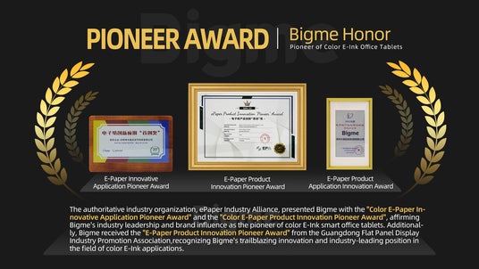 また2020年、Bigmeは権威ある機関である電子紙産業アライアンス(ePaper Industry Alliance)から「Color E-Paper Innovation First Award」および「Color E-Paper Product Innovation First Award」を連続受賞し、さらに2022年には広東省フラットパネルディスプレイ産業促進会(Guangdong China Flat Panel Display Industry Promotion Association)から「E-Paper Product Innovation First Award」を受賞しました。それ以降、BigmeはカラーE-Inkスクリーンリーディングブランドへと成長を遂げています。