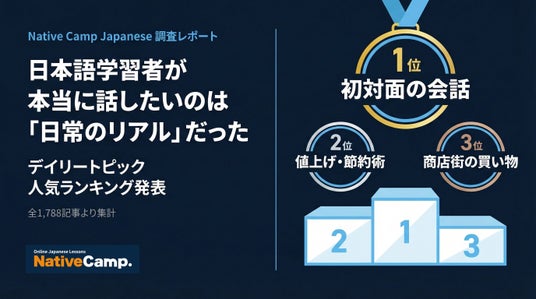 日本語学習者は、どんなトピックに最も関心を持っているのか。24時間365日、日本人講師とのオンライン日本語レッスンを回数無制限で提供する『Native Camp Japanese』(運営:株式会社ネイティブキャンプ)は、オンライン日本語レッスンサービス内の教材「デイリートピック」のランキングを公開し、そこから見える「日本語学習者が興味のあるトピック」を分析・発表します。