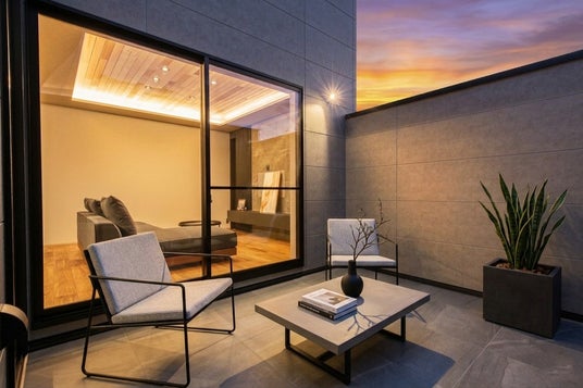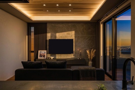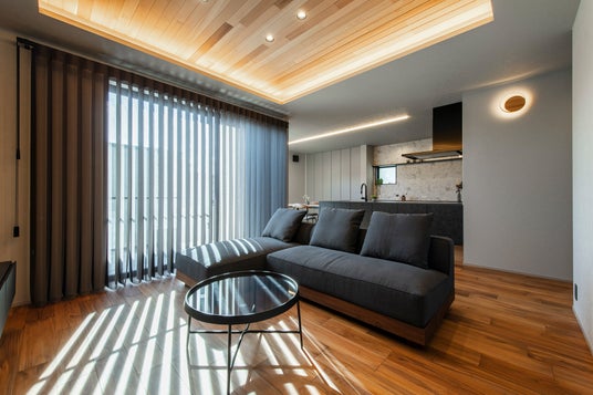 リビングは天井の間接照明と無垢フロアが調和する、ホテルライクでスタイリッシュな空間に仕上げました。LDKからフラットに繋がる「5帖のコンクリートテラス」は、周囲の視線を遮る設計により、屋外でありながらプライバシーの守られた「第二のリビング」として活用いただけます。