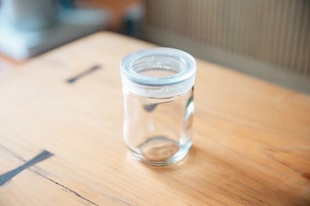 この窪みがあることでフタとガラスボトルがうまく噛み合うため、安心してボトルを載せられるんです。写真ではわかりづらいかもしれませんが、思った以上の安定感。