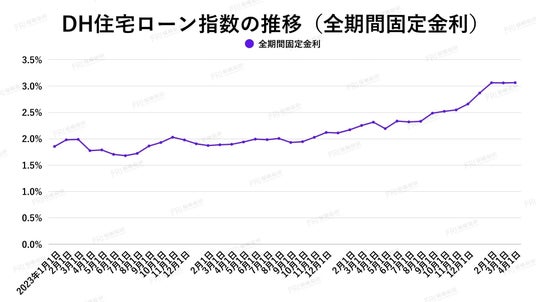 2026年3月の全期間固定金利は横ばいながら、DH住宅ローン指数は3.064%と高水準を維持し、前年からの上昇基調が続いています。全金融機関が金利を引き上げるなど上昇圧力は明確で、フラット35も含め市場全体で水準切り上げが進行しています。