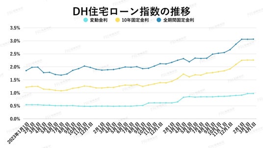 2026年3月の全期間固定金利は横ばいでしたが、DH住宅ローン指数は3.064%と前年の2.171%から大きく上昇しており、明確な上昇トレンドが続いています。足元では高水準での推移が続いています。