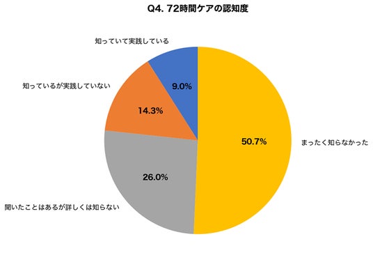日焼け後72時間以内のケアがシミ予防に重要であることを「知っていて実践している」人はわずか9.0%でした。「まったく知らなかった」人が50.7%と半数を超えており、紫外線ダメージの初期対応に関する情報発信の重要性が浮き彫りになりました。