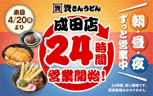 4/20(月)朝8時~、資さんうどん成田店は“24時間営業”を開始します。