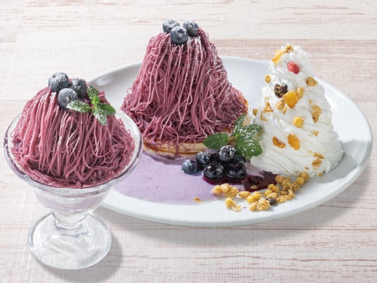 →ブルーベリーモンブランパンケーキ ¥1,580(税込¥1,738) / ブルーベリーモンブランパフェ ¥1,180(税込1,298)