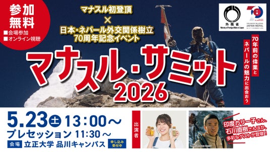 毎日新聞社、日本山岳会、外務省は、5月23日(土)に立正大学品川キャンパスで、ネパールのヒマラヤ山脈に属しているマナスルへ日本隊が初登頂した偉業と、それを機にネパールとの外交関係が樹立してから70年の節目を祝うシンポジウム「マナスル・サミット2026」を開催します。