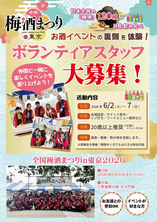 上野恩賜公園・弁天門前を会場に、2026年6月4日(火)から6月7日(日)までの4日間、「全国梅酒まつり in 東京2026」を開催します。
