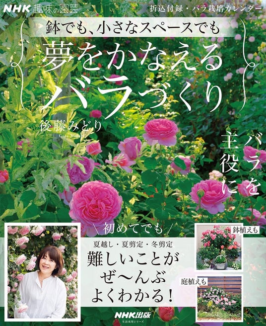 2026年4月20日発売の『NHK趣味の園芸 鉢でも、小さなスペースでも 夢をかなえるバラづくり』ではバラのスペシャリスト・後藤みどりさんが、「鉢植え」「庭植え」別に、バラ栽培のコツや、バラと相性のよい草花などを紹介。1年を通して変化するバラの姿を定点観察で解説しながら、比較観察写真でお手入れの意味や大切さがすっきり理解できます。折込付録「バラ栽培カレンダー」付き。