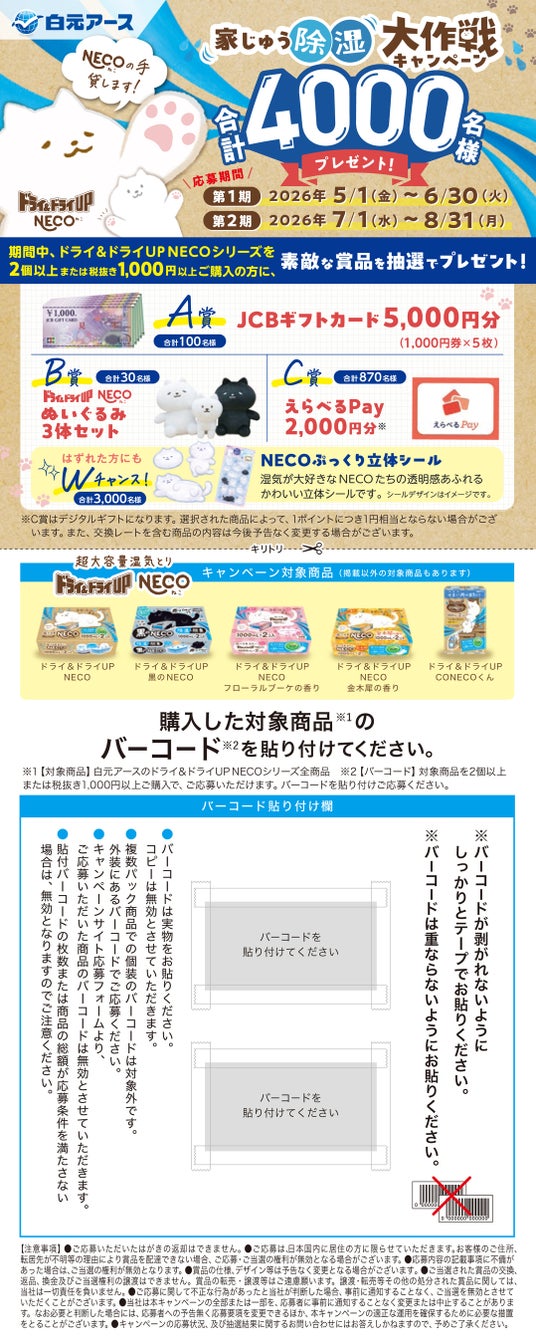 白元アース株式会社(本社:東京都足立区、社長:吉村一人)は、同社の超大容量湿気とり「ドライ&ドライUP NECO(ねこ)」シリーズを購入し応募いただくと、抽選で「JCBギフトカード5,000円分」「ドライ&ドライUP NECO ぬいぐるみ3体セット」「えらべるPay2,000円分」などが合計4,000名様に当たる『NECOの手貸します!家じゅう除湿大作戦キャンペーン』を2026年5月1日から実施いたします。