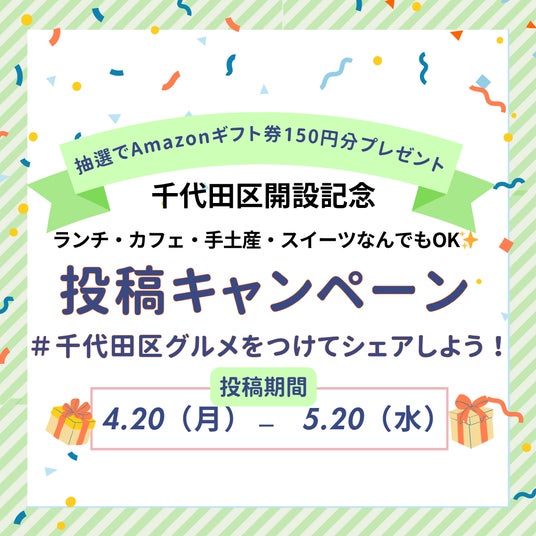 千代田区エリアオープンを記念して、ハッシュタグ「#千代田区グルメ」を付けて千代田区内のランチ・カフェ・手土産・スイーツなどのグルメ情報をピアッザに投稿いただくと、抽選で150円分の電子マネーが当たる千代田区限定プレゼントキャンペーンを実施します。