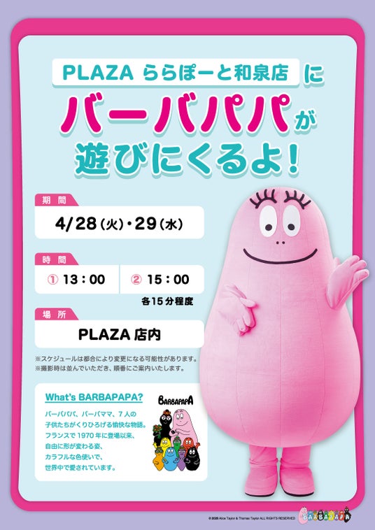 株式会社スタイリングライフ・ホールディングス プラザスタイル カンパニー(東京都新宿区、以下プラザスタイル)は、4月22日「バーバパパの日」を記念し、4月18日(土)~30日(木)をBARBAPAPA WEEKとして、プラザスタイルがマスターライセンスを保有するプロパティ「バーバパパ」のコラボレーション商品の発売やイベントを多数開催いたします。ご家族やご友人をお誘い合わせの上お越しください。