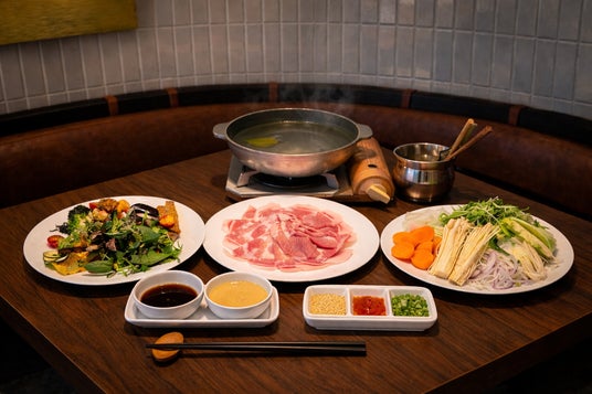 約30種類の食材を、メインのしゃぶしゃぶとともにセミビュッフェ形式で提供します。旭川出身のシェフが、富良野市・中富良野町・美瑛町を中心に野菜・フルーツ・米や味噌まで厳選。館内キッチンスタッフが市営農場を活用して育てた野菜も取り入れるなど、鮮度・安全性ともにこだわった一皿をお楽しみいただけます。サラダのほか、蕪のステーキ、ズッキーニのカルパッチョ、ナスのグリル、アスパラのフリッタータ、春菊を使ったバスクチーズケーキなど、野菜の可能性を引き出す多彩なメニューを揃えています。