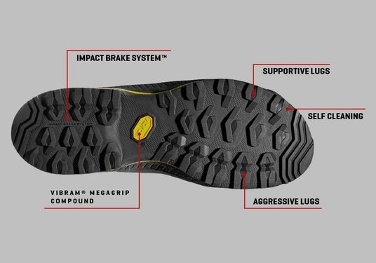 アウトソールのラグパターンを最適化し、泥や土が詰まりにくい設計を採用。さまざまな路面環境でも安定したグリップ力を維持。