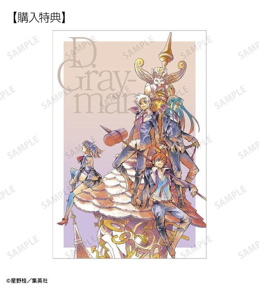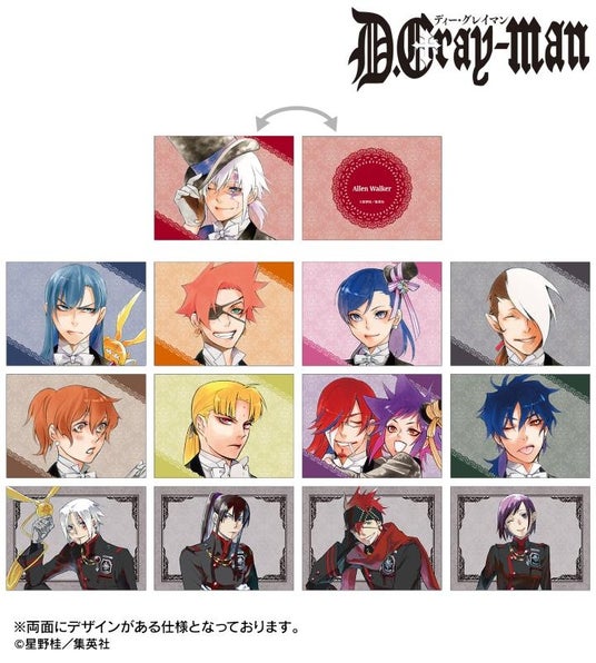 アレン・ウォーカー、ティムキャンピー、神田ユウ、ラビ、リナリー・リー、アレイスター・クロウリー三世、ハワード・リンク、クロス・マリアン、ティキ・ミック、ジャスデロ、デビット、ネア=D=キャンベル、ブックマン、マルコム=C=ルベリエ、千年伯爵、ロード・キャメロット、ワイズリー、フィードラの原作コマイラスト、ちびキャライラスト、カラーイラストをブロマイドに仕上げました。