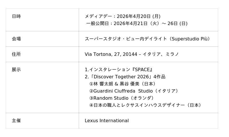 LEXUSは、イタリア・ミラノで開催される世界最大のデザインイベント、「ミラノデザインウィーク2026」*1に出展し、世界中のクリエーションが集結するトルトーナ地区の中心であるスーパースタジオ・ピュー内デイライトにおいて、LEXUSのクリエイティブイニシアチブによるインスタレーション『SPACE』と、新進気鋭のクリエイター (内1組はインハウス) との共創プロジェクトである「Discover Together 2026」の4作品を世界初公開しました。