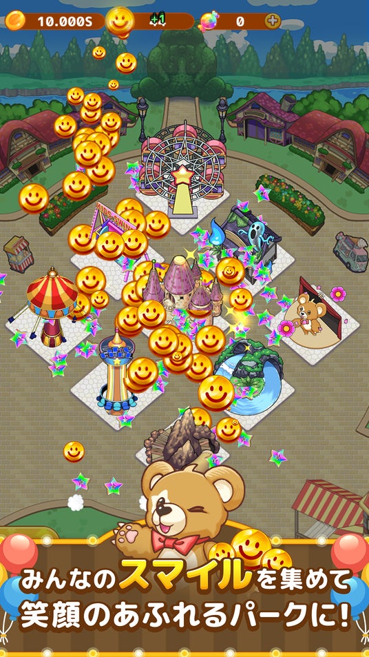 遊園地の発展にあわせて多彩なお客さんが登場。マスコットのスマイリーフレンズ出現時にはボーナスチャンスが発生し、一気に収益を伸ばすことができます。