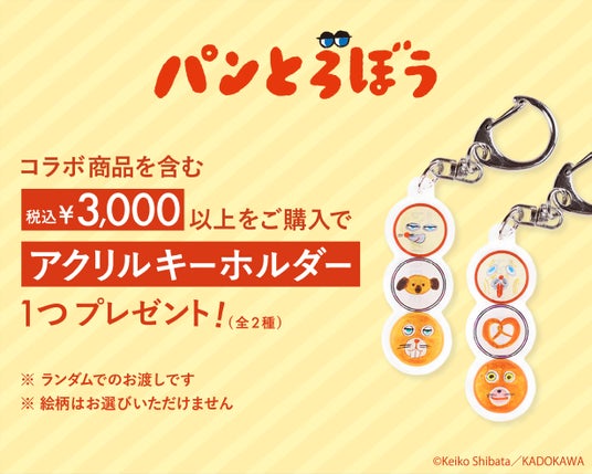 全国の店舗で「パンどろぼう」商品1点以上を含む、税込3,000円毎のご購入で、「オリジナルアクリルキーホルダー」をおひとつプレゼント!